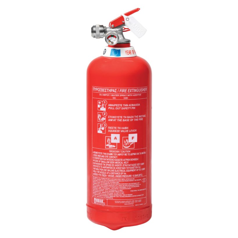 Leírás: 2 literes fluormentes beltéri habbal oltó tűzoltó készülék egyvarratos palackkal, belső műanyag réteggel és nyomásmérő biztonsági kioldó szeleppel zsír- és olajtüzek oltására is.