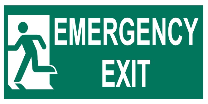 A vészkijárat jelölésére szolgáló angol nyelvű nemzetközi menekülési jelzés.