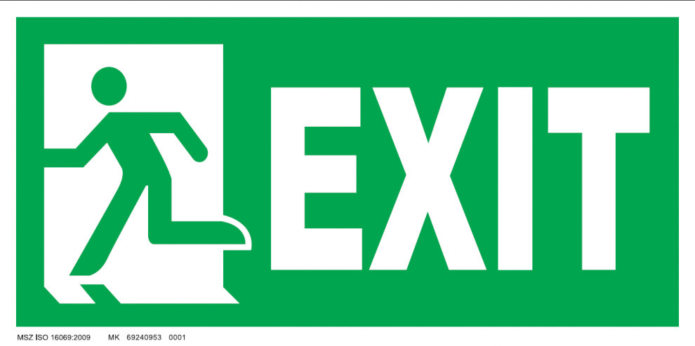 A kijárat jelölésére szolgáló angol nyelvű nemzetközi menekülési jelzés.