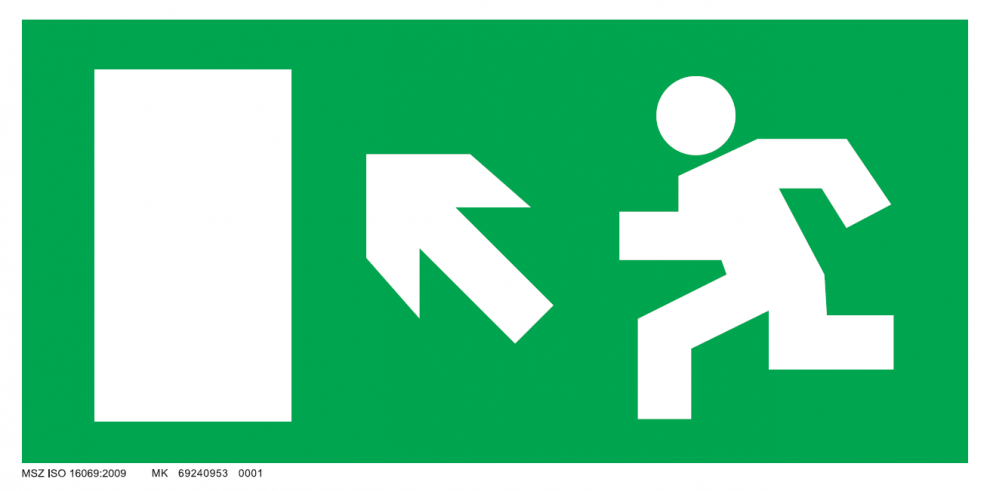 Épületekben és szabadtéren alkalmazható menekülési útvonalat, menekülési útirányt jelző utánvilágító, öntapadó tábla.