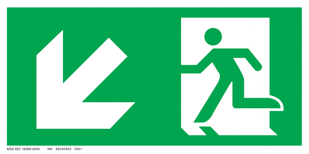 Épületekben és szabadtéren alkalmazható menekülési útvonalat, menekülési útirányt jelző utánvilágító, öntapadó tábla.