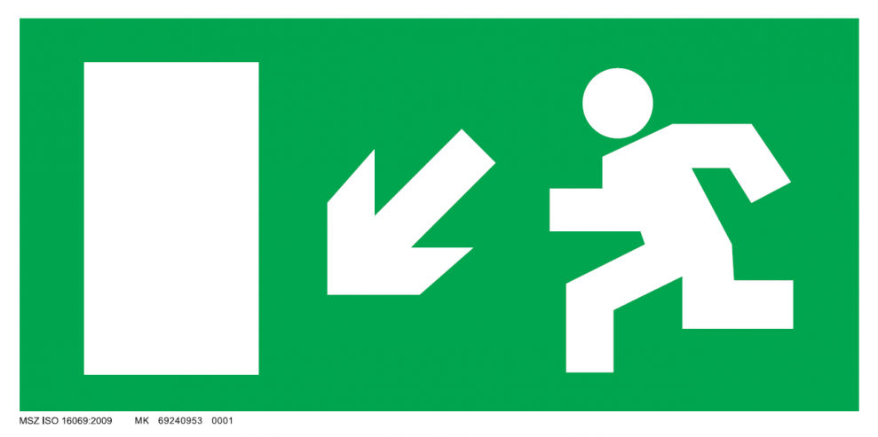 Épületekben és szabadtéren alkalmazható menekülési útvonalat, menekülési útirányt jelző utánvilágító, öntapadó tábla.