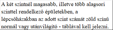 A két szintnél magasabb, illetve több alagsori szinttel rendelkező épületekben, a lépcsőházakban az adott szint számát zöld színű normál vagy utánvilágító - táblával kell jelezni.