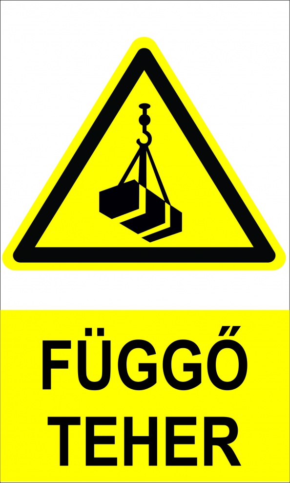 Egy munkavédelmi figyelmeztető jelzés, amely arra hívja fel a figyelmet, hogy a területen daruval vagy más emelőberendezéssel mozgatott, életveszélyes teher található, és tilos alatta tartózkodni. A tábla használatát jogszabályok írják elő az emelési munkálatok biztonsága érdekében.