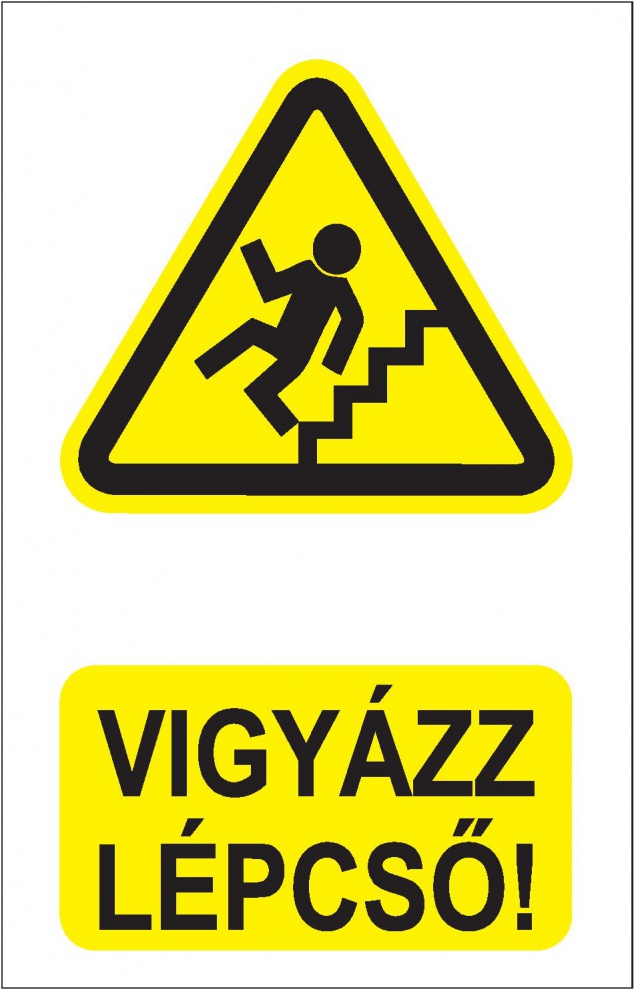 Lépcsőre figyelmeztető munkavédelmi jelzés. Használatával megelőzhetők a szintkülönbségből adódó balesetek.